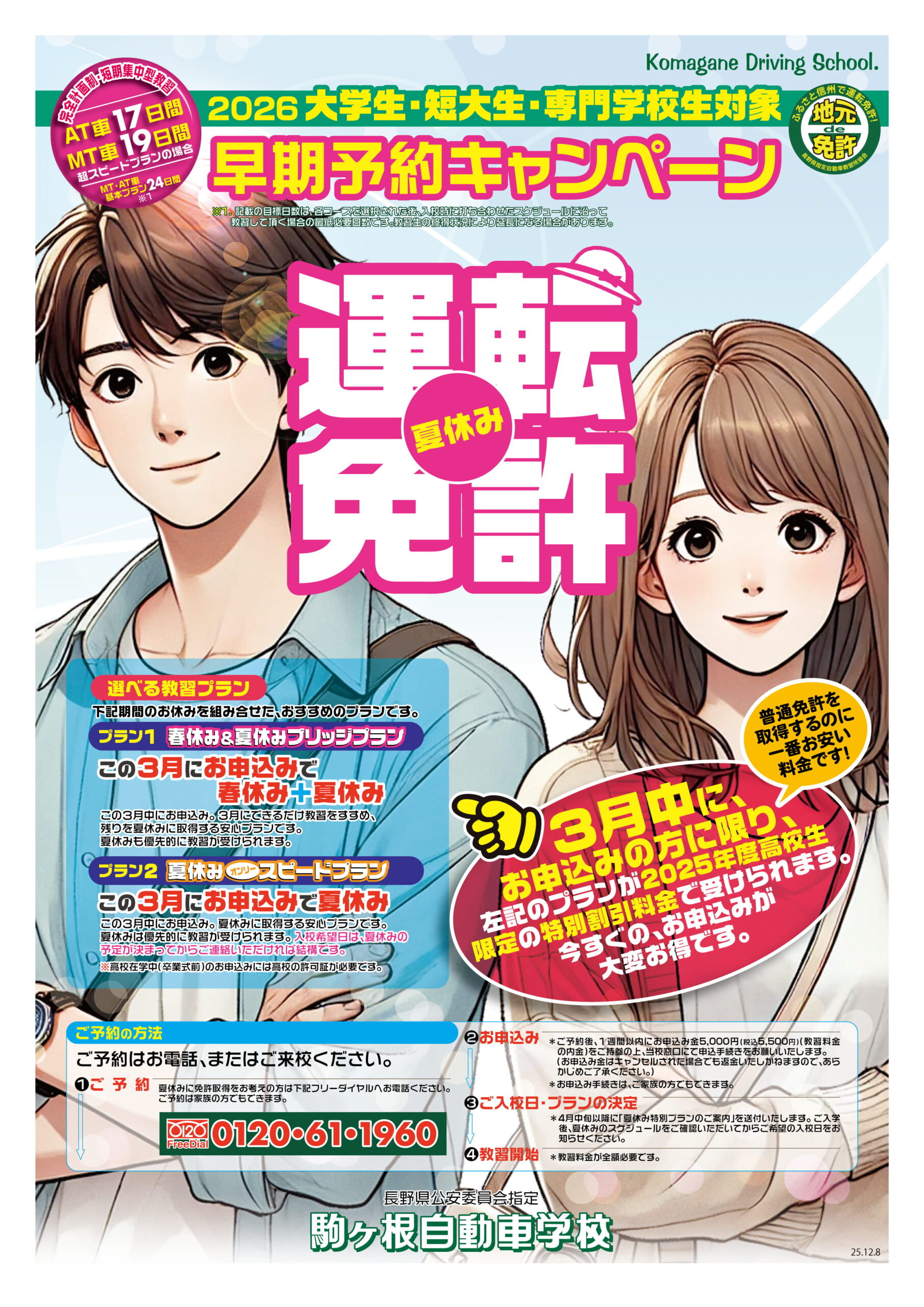 駒ヶ根自動車学校では、2026年 夏休み短期取得プラン(通学)の早期予約キャンペーンを実施しております。